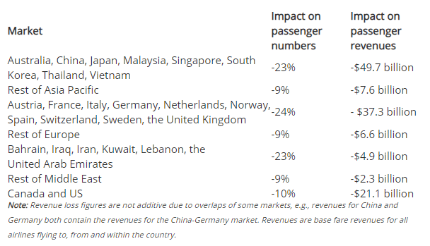 Globally, this fall in demand translates to an 11% worldwide passenger revenue loss equal to $63 billion. China would account for some $22 billion of this total. Markets associated with Asia (including China) would account for $47 billion of this total.