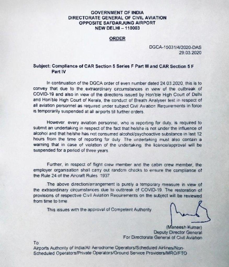 The DGCA said in its order that due to the “extraordinary” circumstances over COVID-19 and directions issued by high courts in Delhi and Kerala, the breath analyser tests for “all aviation personnel” were temporarily suspended “at all airports till further orders”.